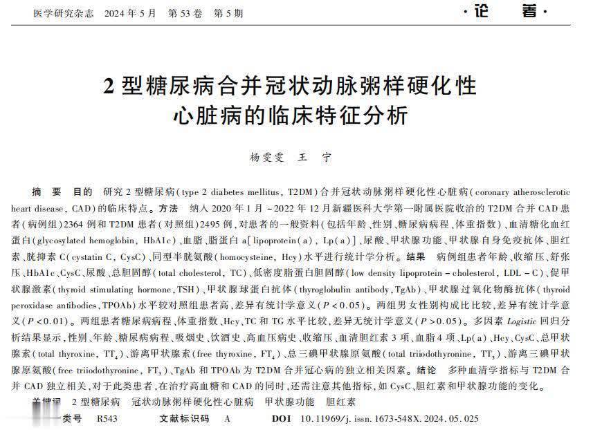 参考资料[1]杨雯雯.2型糖尿病合并冠状动脉粥样硬化性心脏病的临床特征分析,医学研究杂志,2024-05-15