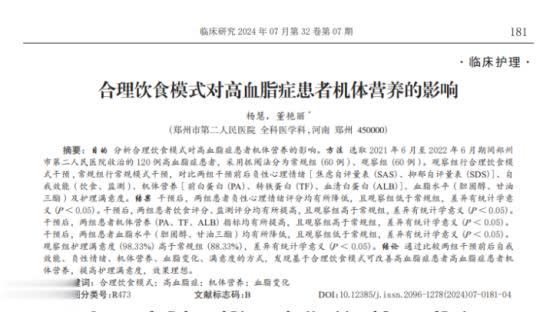 参考资料:[1]杨慧,董艳丽.合理饮食模式对高血脂症患者机体营养的影响[J].临床研究,2024,